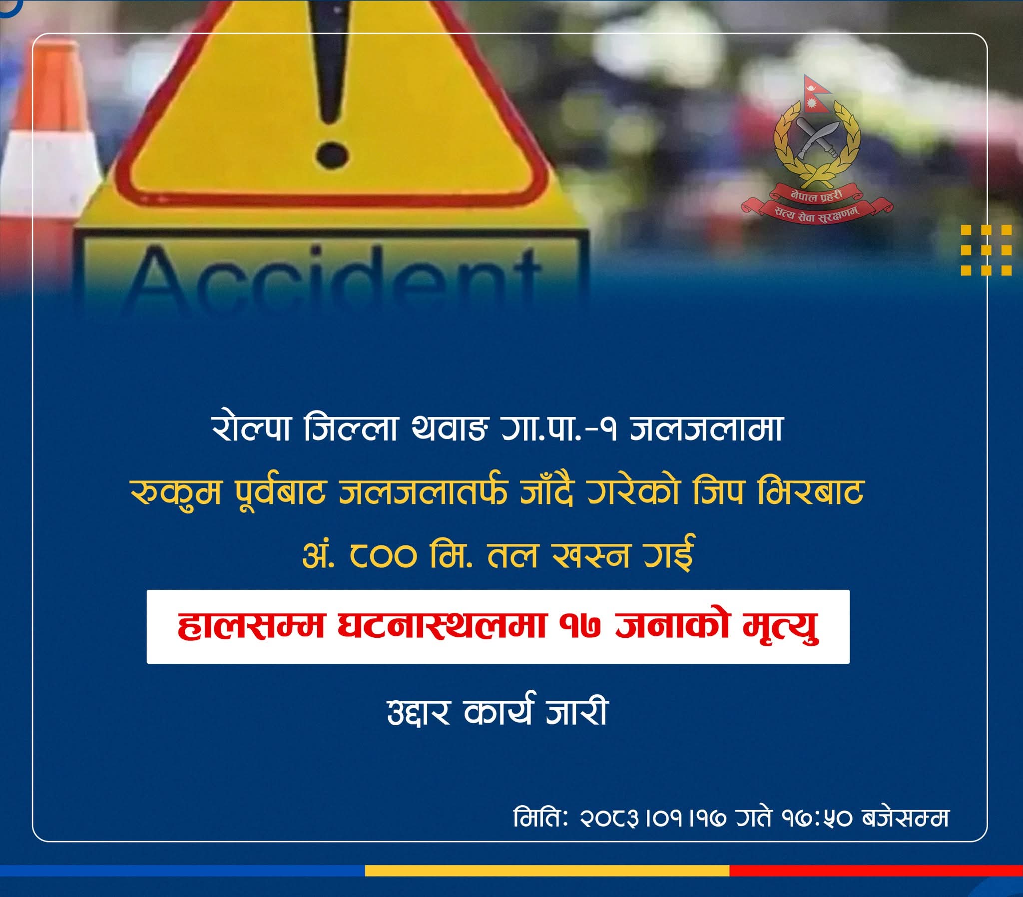 रोल्पाको थवाङ गाउँपालिका -१, जलजला नजिकै आज भएको जिप दुर्घटनामा १७ जनाको मृत्यु भएको छ । रुकुम पूर्वको रुकुमकोटबाट जलजला जाँदै गरेको लु १ ज ४१६७ नम्बरको जिप दुर्घटना हुँदा १७ जनाको घटनास्थलमै मृत्यु भएको र अन्य एकजना घाइते भएको प्रहरीले बताएको छ ।
